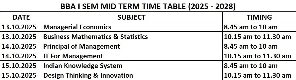 BBA 1st Sem MID TERM Time Table ( 2025 – 28 )