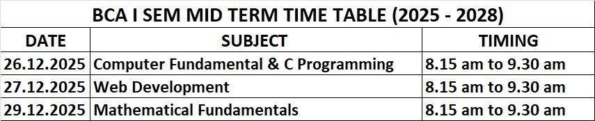 BCA I SEM MID TERM TIME TABLE (2025 – 2028)