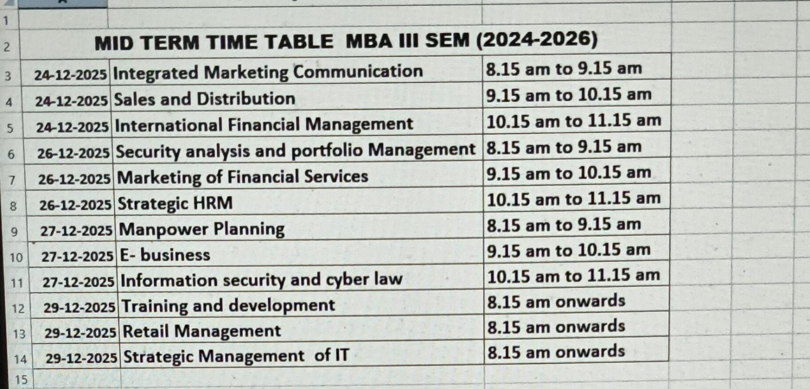 MBA III SEM MID TERM TIME TABLE (2024 – 2026)