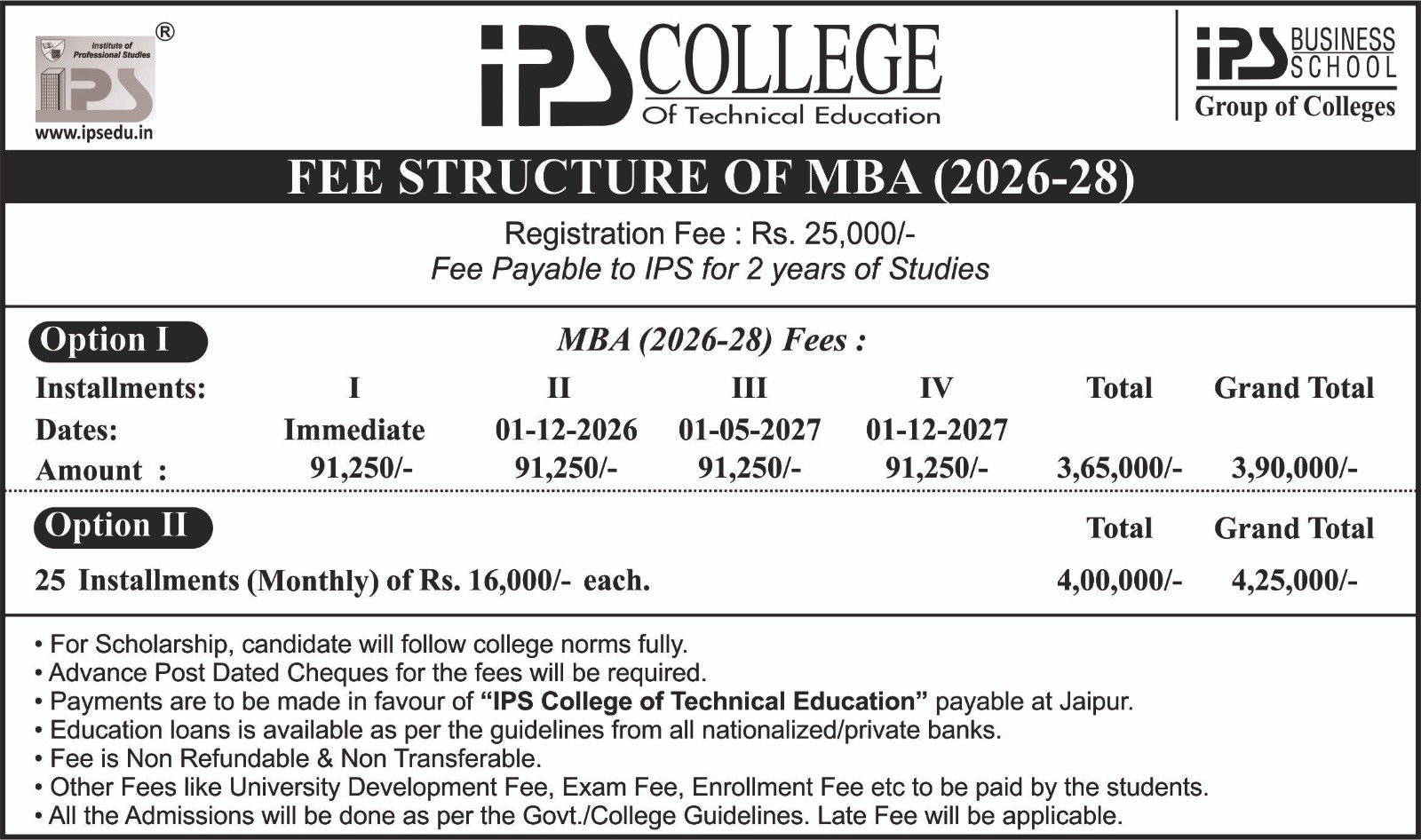 Offline : Application form can be purchased from IPS Campus on cash payment of Rs. 900/- & submit the same duly filled in with requisite documents.